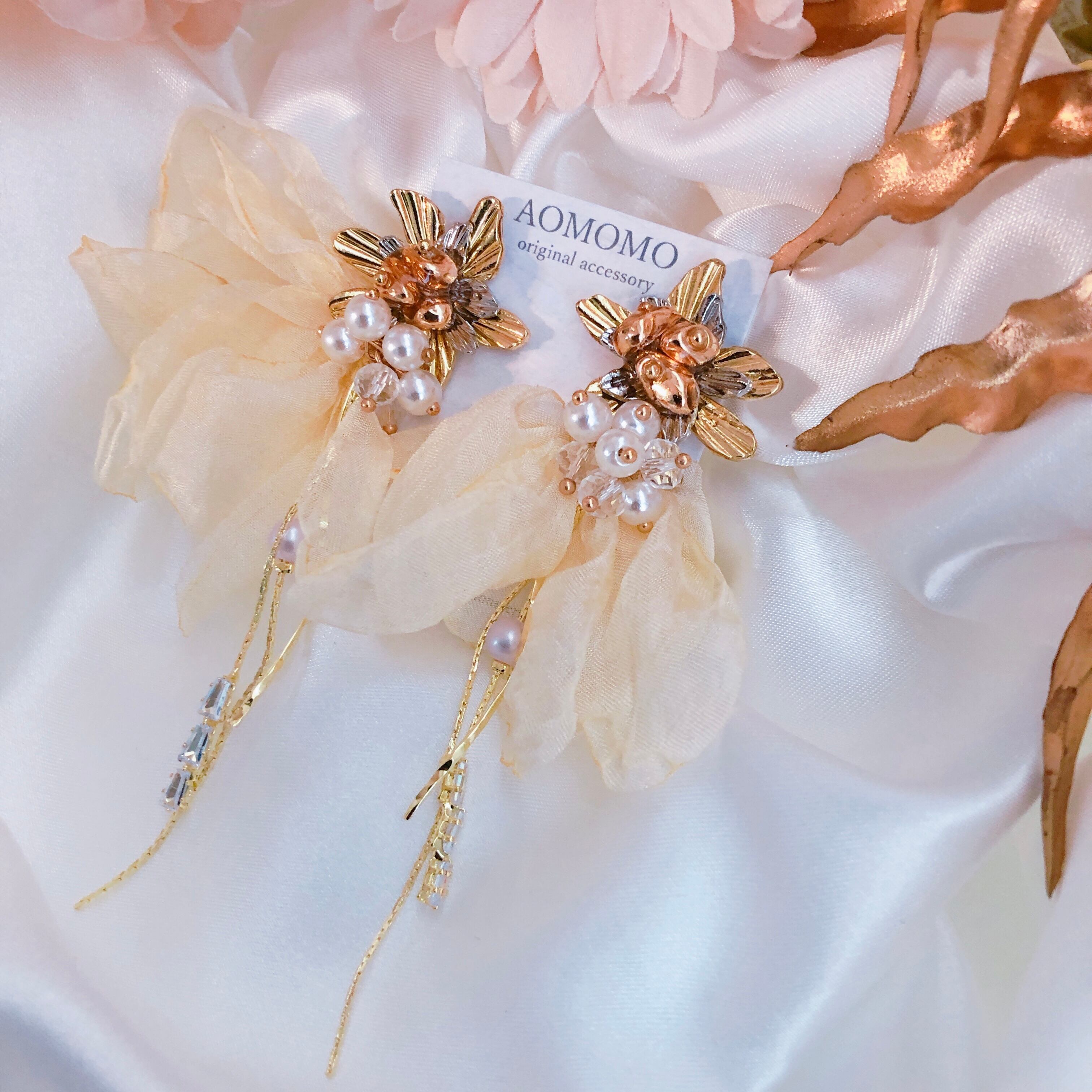 【金属アレルギー対応】大ぶり オーガンジー ゴールド バイカラー ウェディング ブライダル 前撮り 結婚式 挙式 披露宴 フォトウェディング
