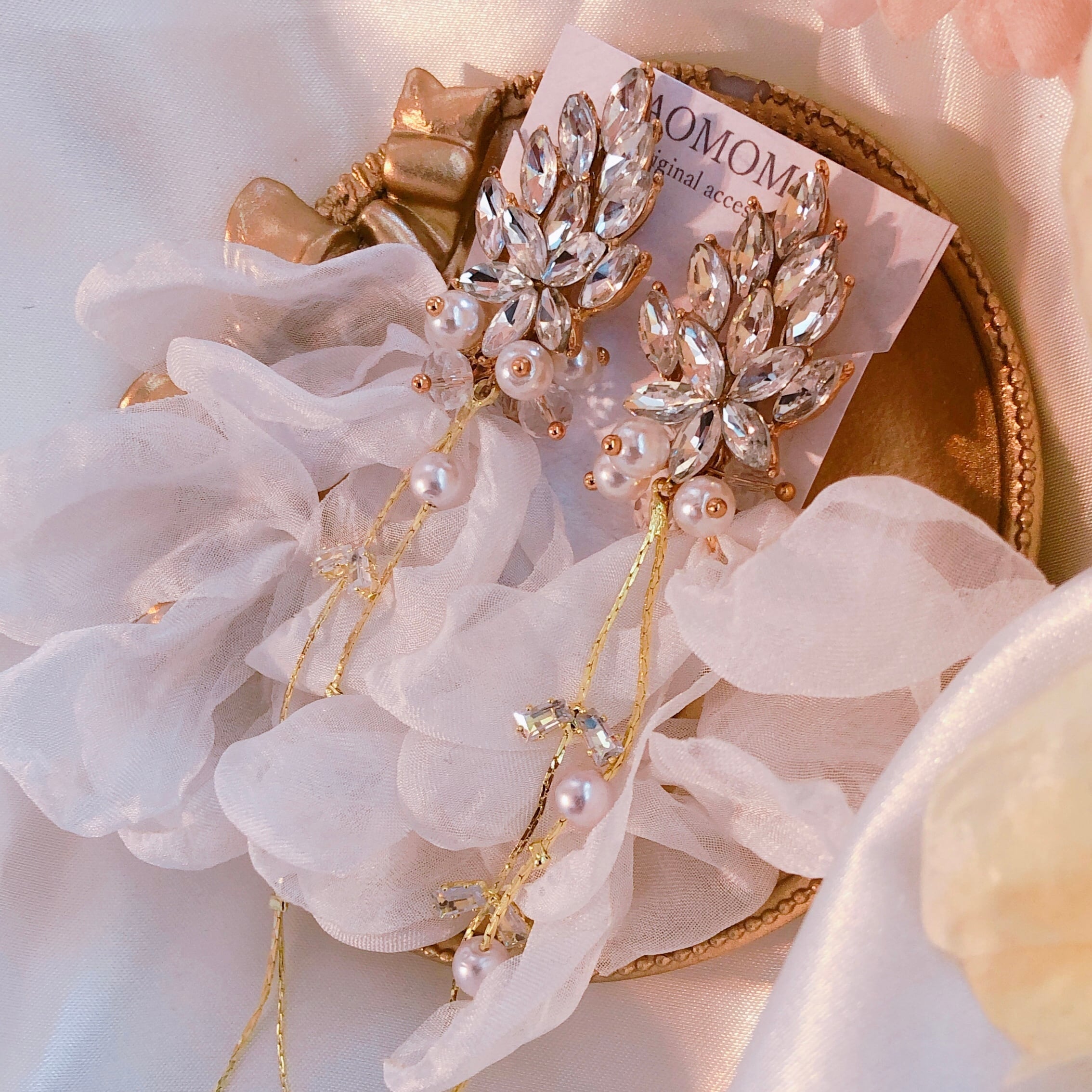 煌めき輝くビジューとふんわりした柔らかい触り心地のオーガンジー❤︎美しく透け感あるオーガンジーに魅了され揺れるたびに人目を惹く❤︎しなやかに繊細に流れるパールとビジューのロングチャームも気品高く花嫁様にふさわしい一品です❤︎