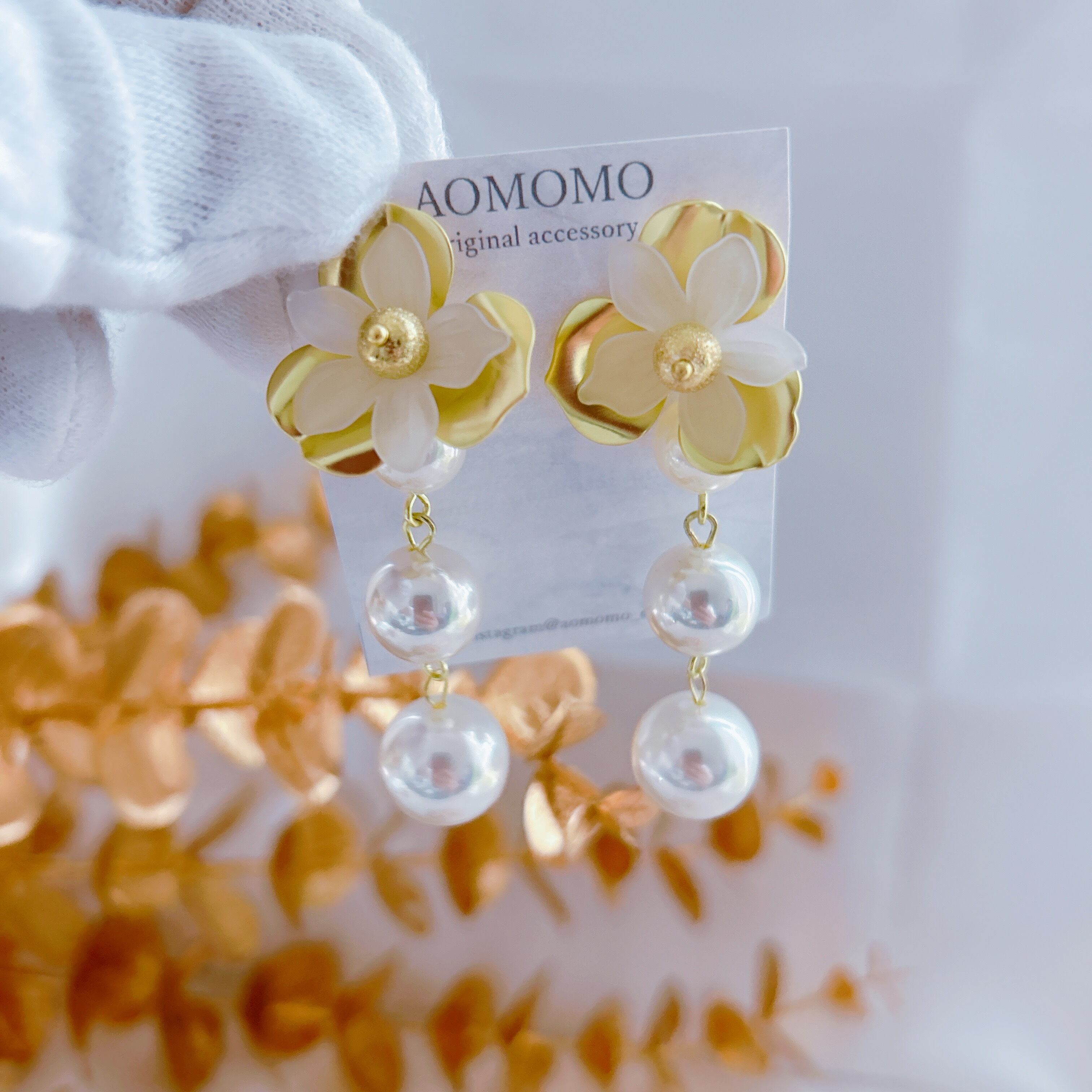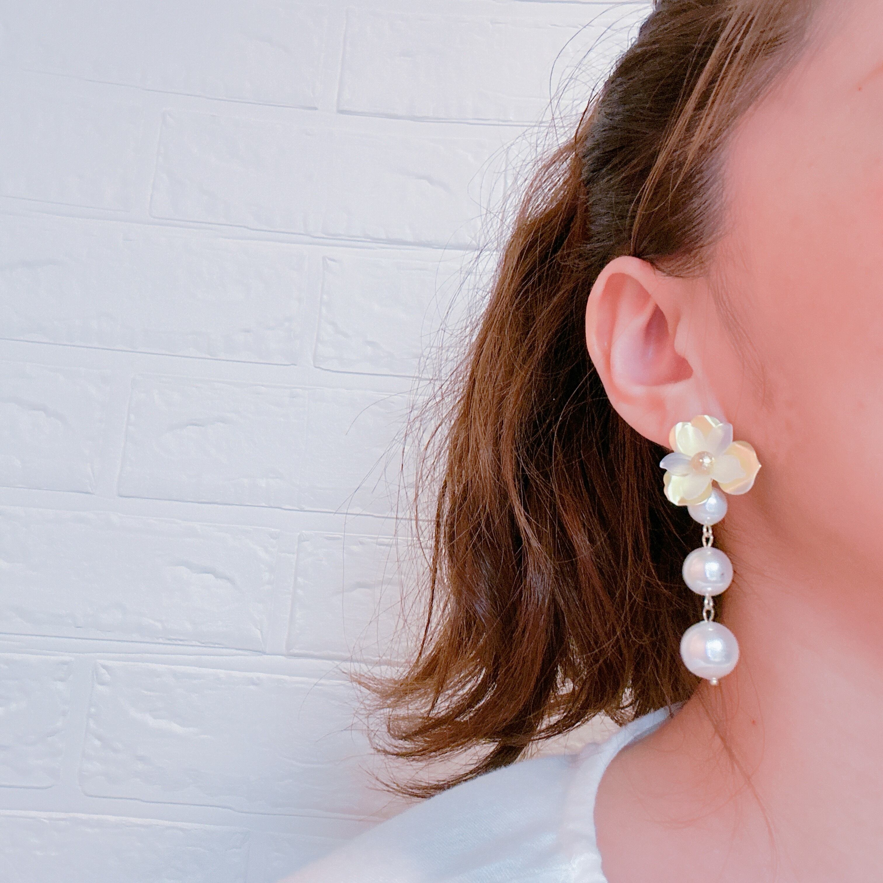 トップのフラワーはゴールド&ホワイトのバイカラー♡どちらもマット素材♡3連のパールは高品質の良質なパールを使用してます♡