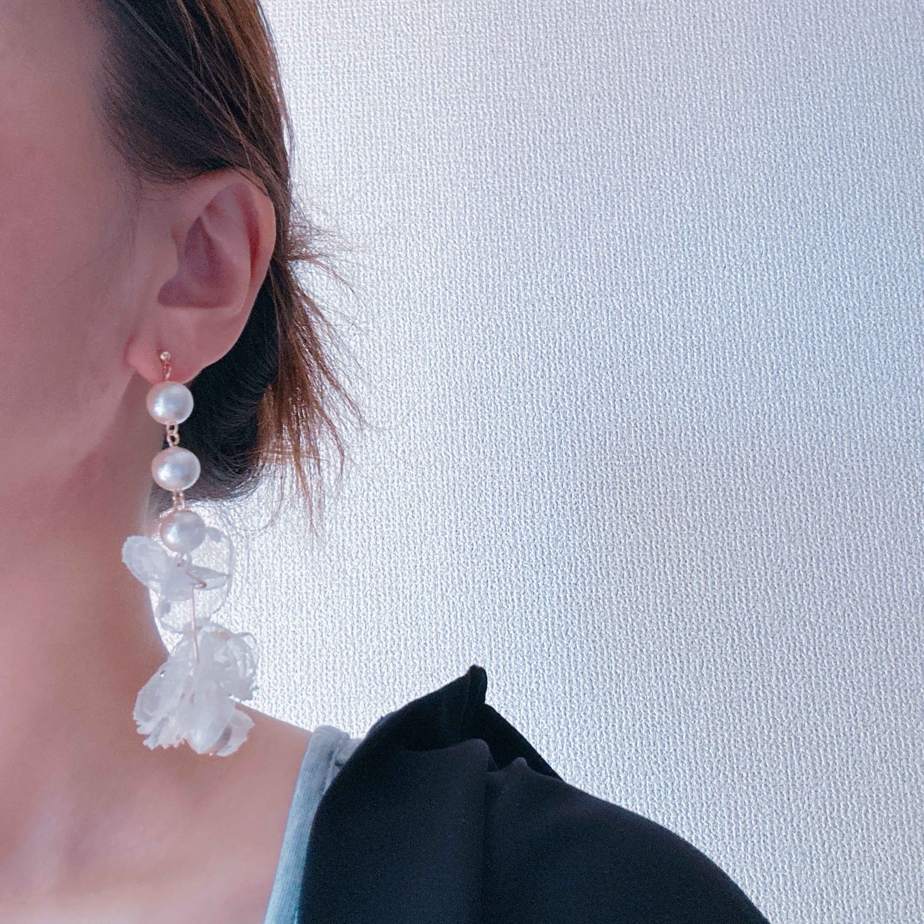 【金属アレルギー対応】アイボリー アシンメトリー華奢なオーガンジーアクセサリー 3連のコットンパール ウェディング 結婚式 披露宴 前撮り パーティー