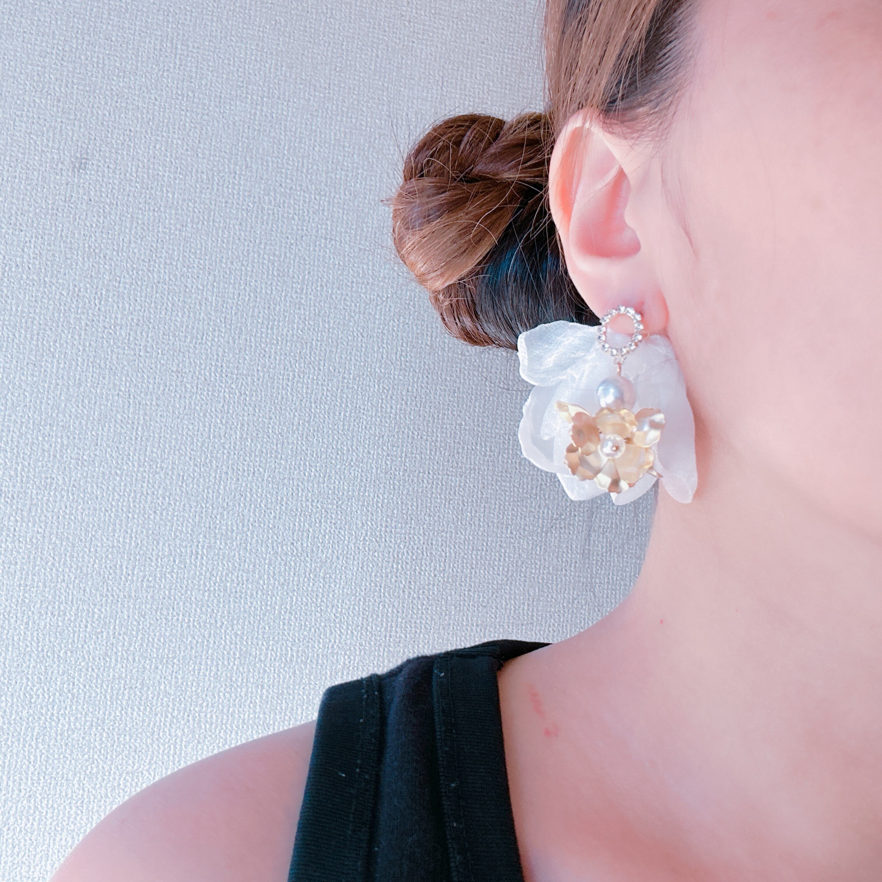 大ぶりのピアスが3通りから4通りのスタイルで楽しめます♡オーガンジー素材の透け感とロングチャームの華奢なデザインが女性らしさを引き立てます♡
